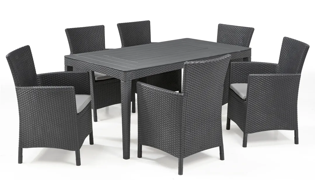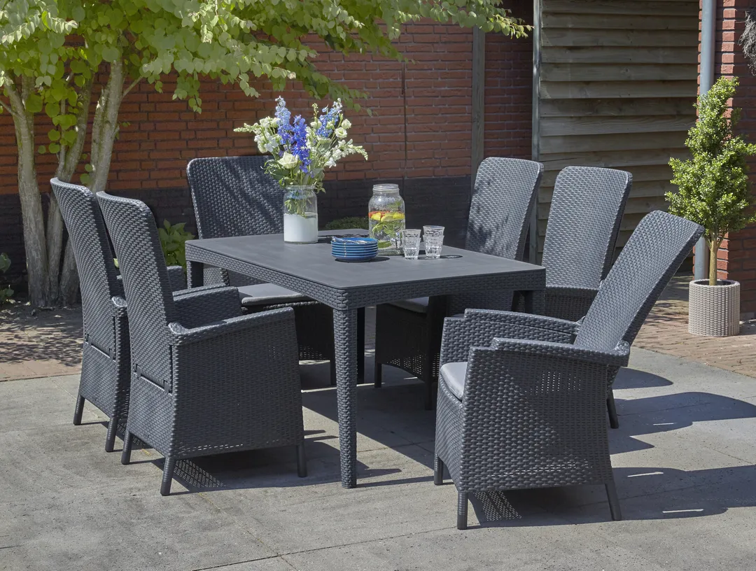 A Girona asztalcsalád azoknak fogja elnyerni a tetszését, akik értékelik a természetes rattanra emlékeztető, lekerekített vagy lapos szövésű mintával díszített bútorok stílusát és eleganciáját. Az asztalt rendkívül könnyű összeszerelni és tisztán tartani. A termék ellenáll a kölső hatások okozta sérüléseknek, a kedvezőtlen időjárási körülmények és az UV-sugarak hosszú távú hatásainak is.