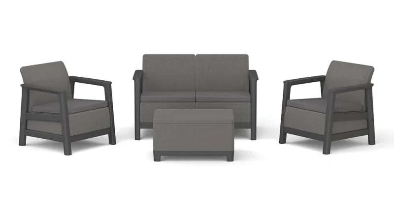 A garnitúra nedvesség- és UV-álló anyagokból készült, így a bútor a mindennapi kültéri használat során is megőrzi megjelenését és funkcionalitását.