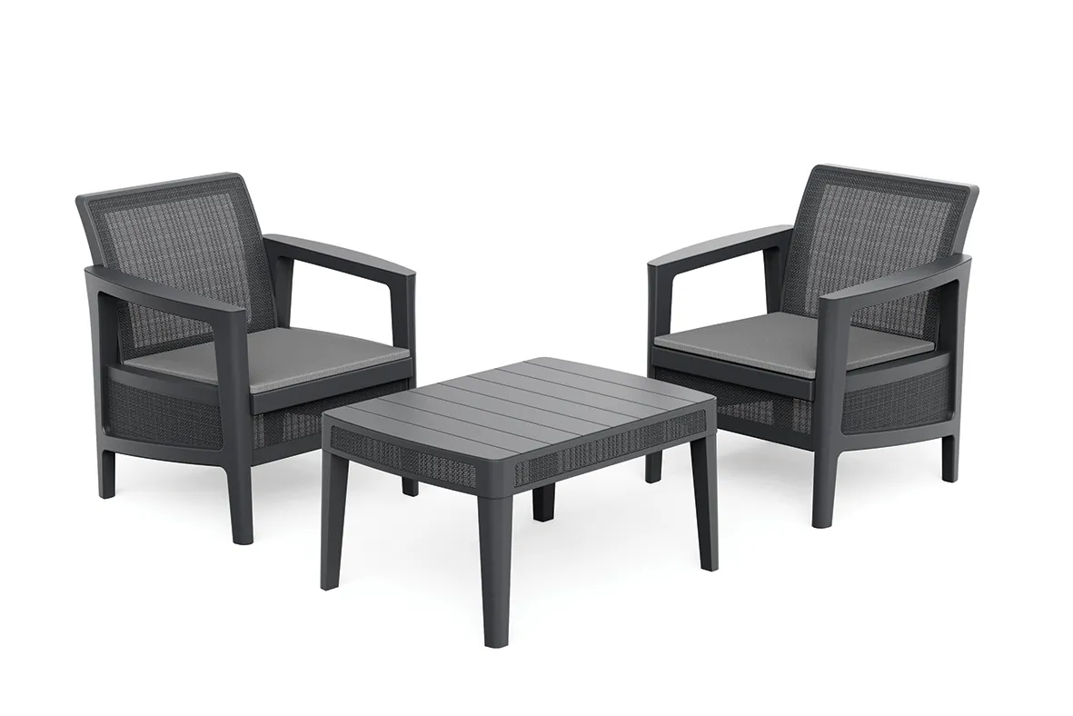 A garnitúra két fotelt és egy praktikus dohányzóasztalt tartalmaz – tökéletes konfiguráció egy kényelmes pihenőhely kialakításához, még egy kis helyiségben is.