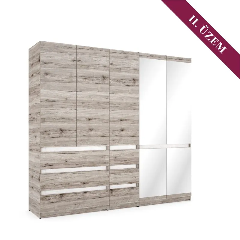 160, 239 és 318 cm-es méretben kapható. Színeit tekintve, szinte nincs olyan lakás, ahova ne tudna beilleszkedni. Különlegességét adja még a gardrób ajtón található üveg betét, amin keresztül sejtelmesen látható a gardrób belseje. Mindezt még fokozza az üvegen az egyszerű, de nagyon elegáns dekorációs elem. Tolóajtajának köszönhetően megkönnyíti a gardrób használatát. Opcionálisan választható termékek: – sarokpolc – tolóajtós sarokelem – fózolt tükör – tükör – fiókos alsó magasító – tolóajtós felső magasító.