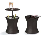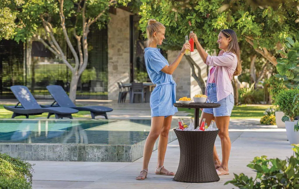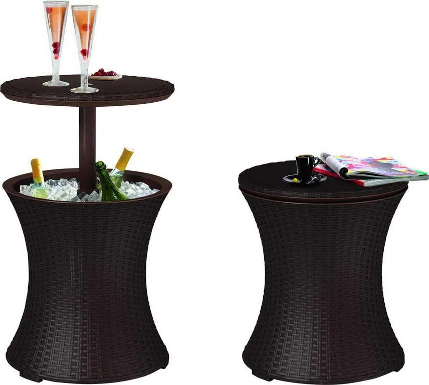 Funkcionális kerti italtartó asztal. Összecsukva kézreálló dohányzóasztal, szétnyitva klasszikus bárasztal italhűtő tárolóval. Az elegáns dizájn, a fonott rattant imitáló kivitelezés és a funkcionalitás azt eredményezi, hogy a Rattan Cool Bar nagy segítségünkre válik a kerti baráti vagy családi összejövetelek során.