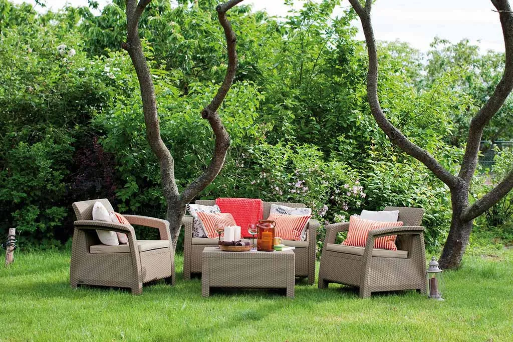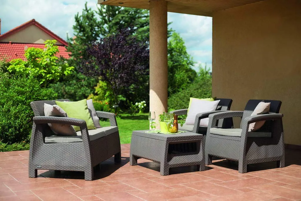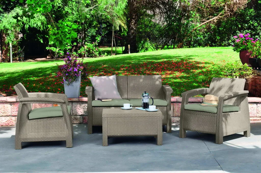 A stílusos Corfu szabadidő bútor szett maximális kényelmet garantál a felhasználók számára. A szettet modern dizájn jellemzi, melyet fonott rattan inspirált. A szett stabilitását és kényelmét erős felépítésének és átgondolt szerkezetének köszönheti. A bútor szett egy kétszemélyes kanapét, két fotelt és egy asztalt tartalmaz. A Corfu termékvonal – kényelmes párnákkal – háromféle színben kapható. A bútorok ellenállnak az időjárás viszontagságainak és az UV sugárzásnak.