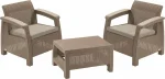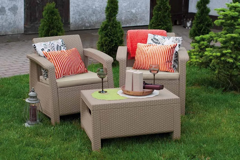 Szépség és elegancia egy szettben. A bútorok formája és a szett optimális mérete lehetővé teszi kisebb kertek és erkélyek berendezését is. A szett egy asztalt és két puha párnával rendelkező fotelt tartalmaz. A termék eleganciája, kényelme és a vonalvezetése garantálja a kellemes pihenést a szabad levegőn. A bútorok további előnye az egyszerű összeszerelhetőség és a könnyű tisztán tartás.