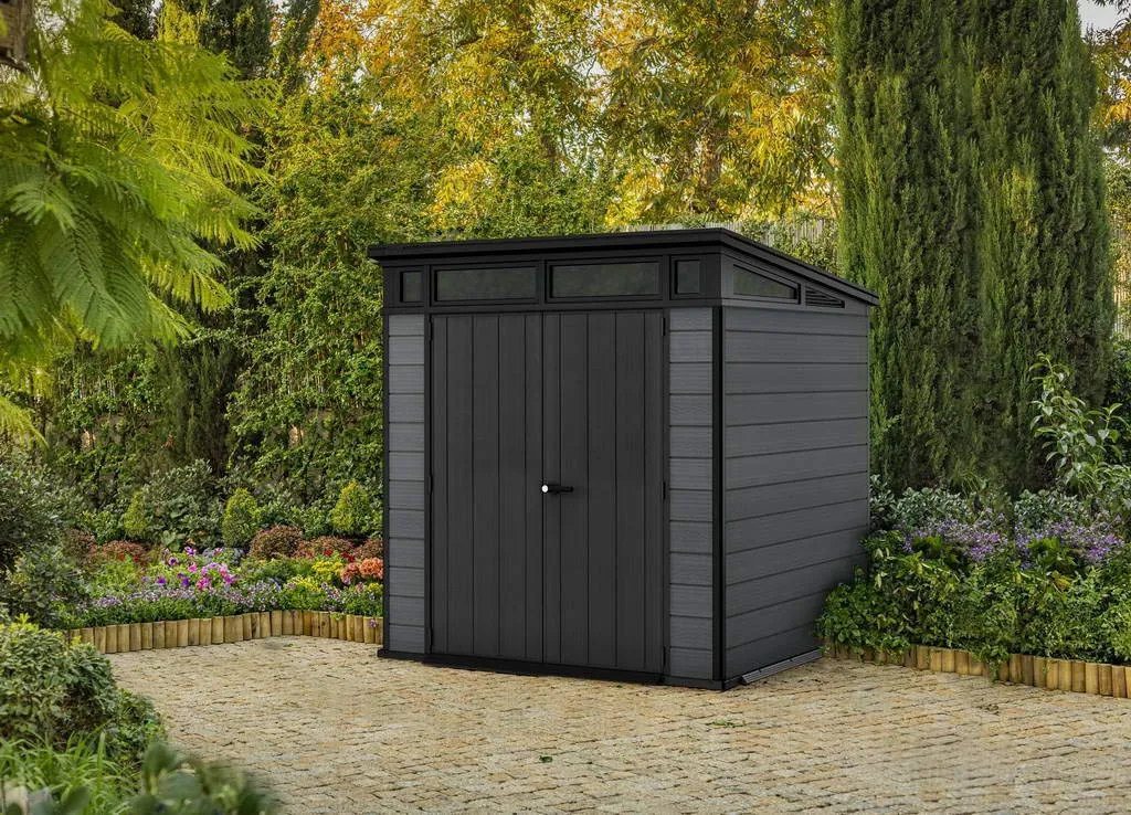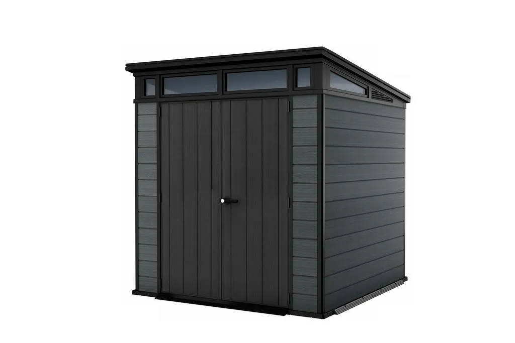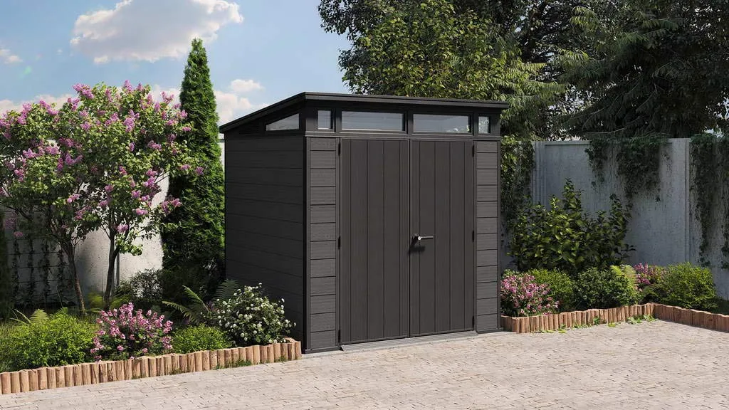 A CORTINA 7×7 szerszámos ház a modern dizájn és a funkcionalitás tökéletes egyensúlyát kínálja. Az egyoldalas tető, a három oldalon beépített tetőablakok és a letisztult, kétszárnyú ajtó kiemelik a ház eredeti és korszerű jellegét. Az innovatív EVOTECH™ kompozit anyagból készült kétrétegű falak rendkívüli tartósságot biztosítanak, miközben a felület textúrája megtévesztően hasonlít a természetes faanyagra, így elegáns megjelenést kölcsönöz a kertednek.