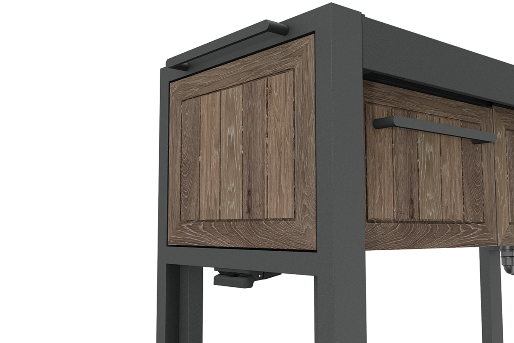 A Deco Hosting egyetlen mozdulattal átalakítható: a polcok oldal irányba kihúzhatók, további helyet teremtve harapnivalóknak, italoknak és dekorációknak – tökéletesek bármilyen alkalomra.