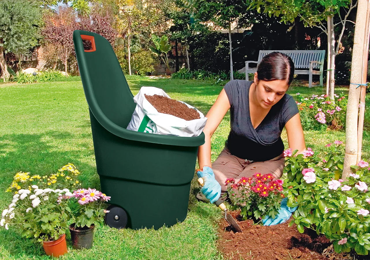 Az egyedi megjelenésű 55L-es kapacitású Easy Go egy nagyon könnyű, de funkcionális talicska. A megfelelően átgondolt szerkezet és a kényelmes fogantyú jelentősen megkönnyíti a rakomány mozgatását. Ideális az udvaron, vagy a pincében végzett kerti munkálatokhoz. Az időjárás viszontagságainak ellenálló műanyagból készült, nem igényel karbantartást.