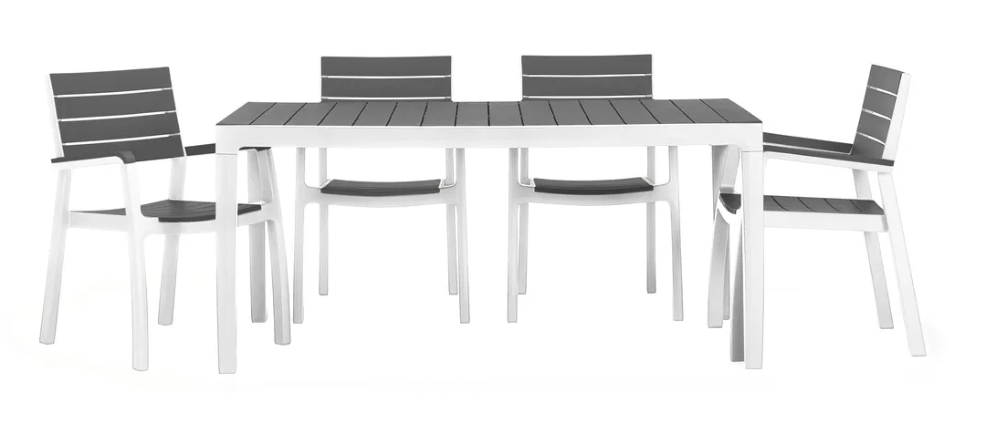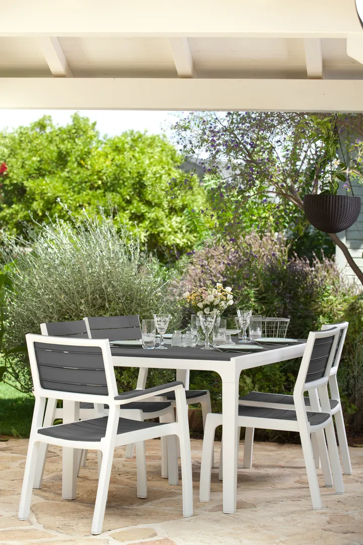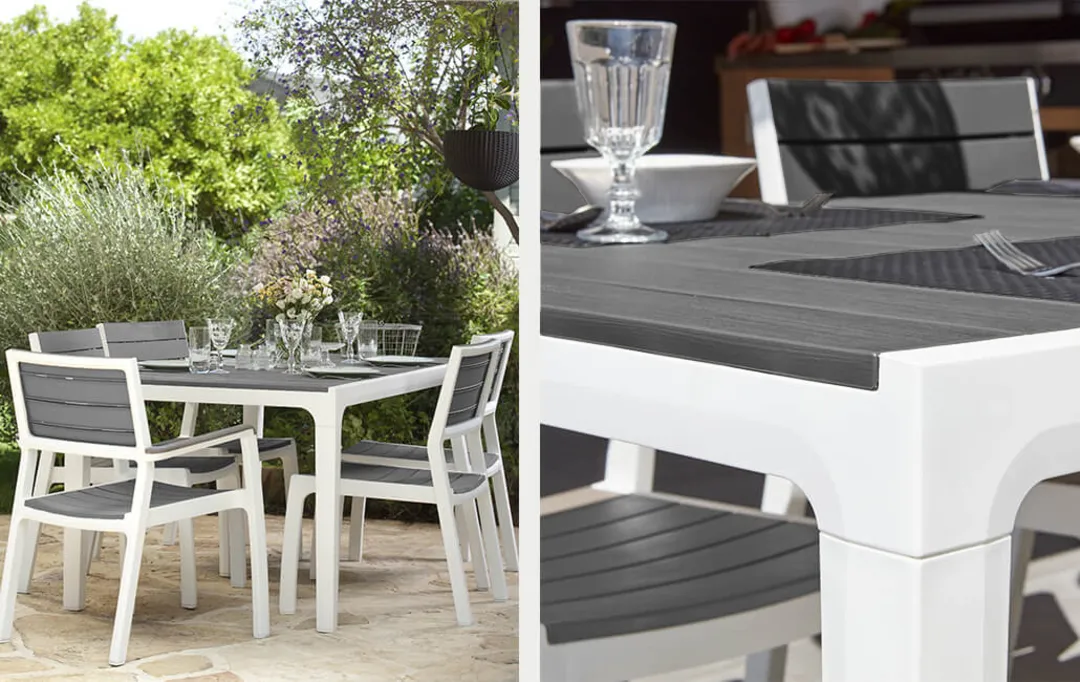 A Harmony asztal stílusos és karcsú felépítése elnyeri mindenkinek a tetszését, aki szeret a szabadban étkezni. A termék egyesíti a fából készült asztalok megjelenést a műanyag elemek praktikus felhasználásával. Az asztal ellenáll az időjárás viszontagságaival szemben. Nagyon könnyen tisztítható és egyszerűen összeszerelhető.