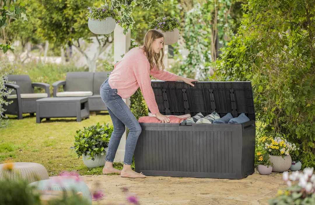 A Comfy 270L-es tárolóval mind a munka, mind a pihenés kényelmesebbé válik a kertben. A tárolónak köszönhetően minden kerti szerszám kézközelben lesz. A hagyományos formatervezés és az univerzális kinézet is hozzájárul, hogy a tároló tökéletesen mutat bármely kertben. A termék további előnyét képezik a felszerelhető görgők, amelyek még a legjobban megpakolt ládák mozgatását is jelentősen megkönnyítik.