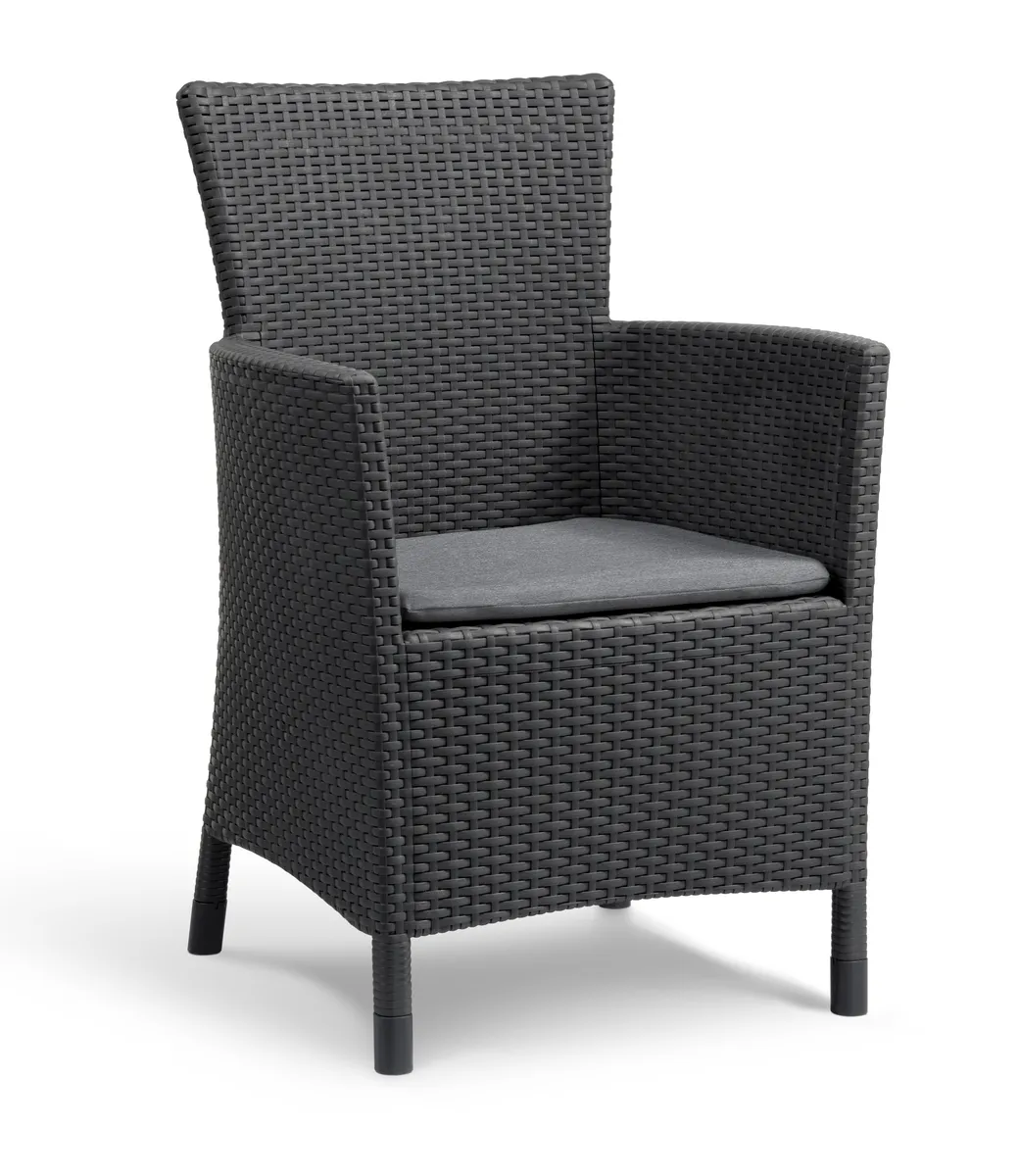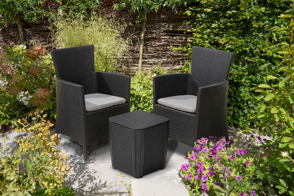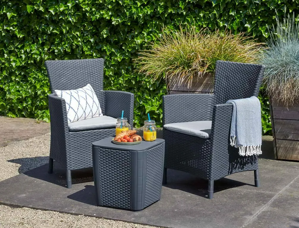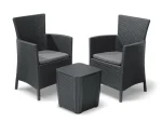 Az Iowa Balcony egy erkélybútor szett, amelyet stílusosan kivitelezett rattan hatású felület jellemez. A készlet két karosszéket és egy 2 funkciós Luzon asztalt tartalmaz, amely különböző tárgyak és kerti kiegészítők tárolására is alkalmas. A megfelelő profilú üléstámlák és a puha párnák nagyon kellemessé teszik a szabadban töltött pihenés pillanatait. A könnyen tisztítható bútorszett tartós és ellenáll a kedvezőtlen időjárási körülményeknek, valamint az UV-sugaraknak. Klasszikus színekben kapható, összeszerelése nagyon egyszerű, nem igényel speciális szerszámokat.