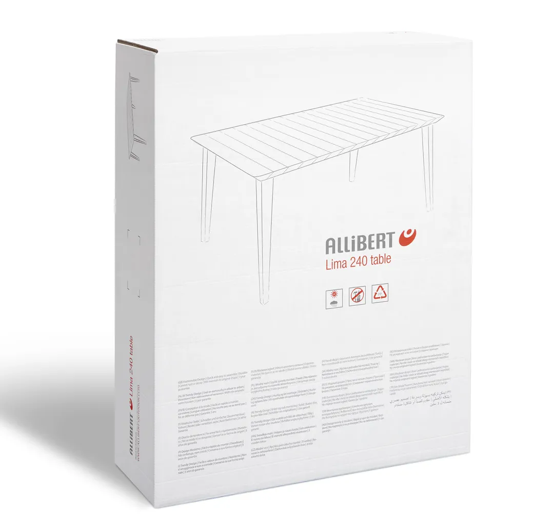 A Lima 240 és 320 funkcionális asztalok fő előnye az egyszerű, univerzális formájuk, melynek köszönhetően bármilyen stílusú térbe passzolnak, legyen az akár hagyományos, vagy modern kialakítású. A széles asztallap jól használható nagy családi lakomákhoz vagy baráti összejövetelekhez a kertben. Ezek az extra nagy asztalok akár 8-12 személyt is kiszolgálnak. Az asztal nagyon könnyen összeszerelhető és tisztítható; ellenáll a kedvezőtlen időjárási körülményeknek és az UV-sugaraknak is.