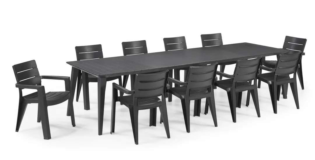 A Lima 240 és 320 funkcionális asztalok fő előnye az egyszerű, univerzális formájuk, melynek köszönhetően bármilyen stílusú térbe passzolnak, legyen az akár hagyományos, vagy modern kialakítású. A széles asztallap jól használható nagy családi lakomákhoz vagy baráti összejövetelekhez a kertben. Ezek az extra nagy asztalok akár 8-12 személyt is kiszolgálnak. Az asztal nagyon könnyen összeszerelhető és tisztítható; ellenáll a kedvezőtlen időjárási körülményeknek és az UV-sugaraknak is.