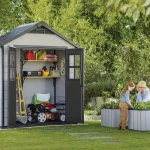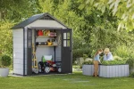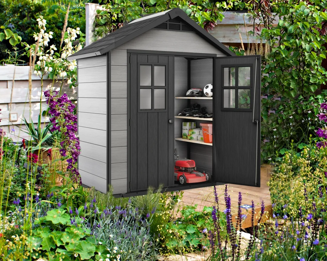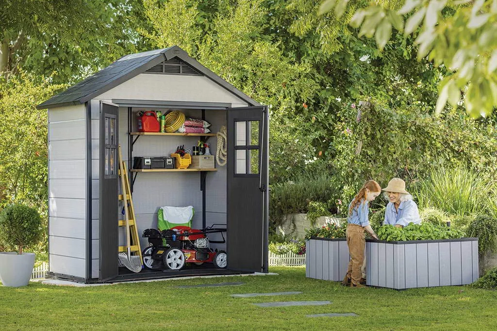 Az OAKLAND 754 egy praktikus és rendkívül tartós szerszámos ház, amely minden kerti tárolási igényt kielégít. Egyedi gyanta kompozitból készült dupla falú panelei rendkívül ellenállóak, így megvédik a tárolt tárgyakat a kedvezőtlen időjárási viszonyoktól. A nagy belső térben kényelmesen elférnek a kerti szerszámok, eszközök, fűnyíró és akár egy létra is, így mindent rendezetten és könnyen hozzáférhetően tárolhatsz.