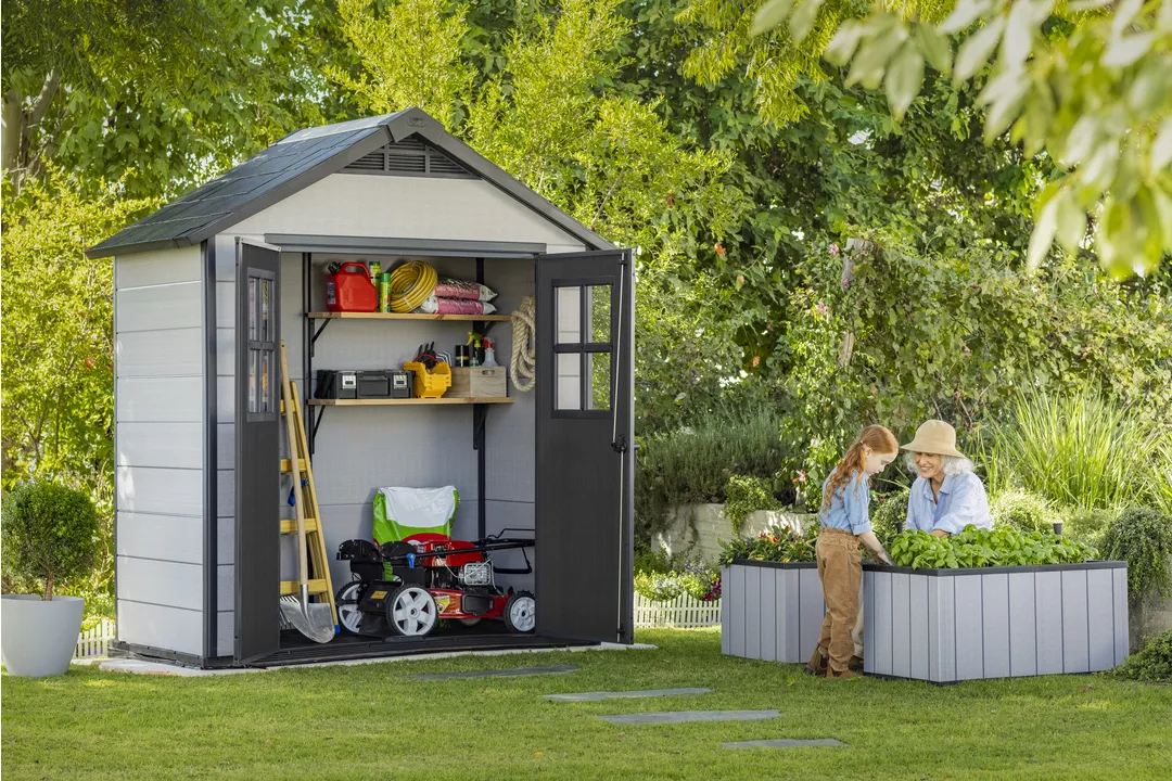 - Tágas belső tér: Elég helyet biztosít a kerti szerszámok, fűnyíró és létra tárolására is
