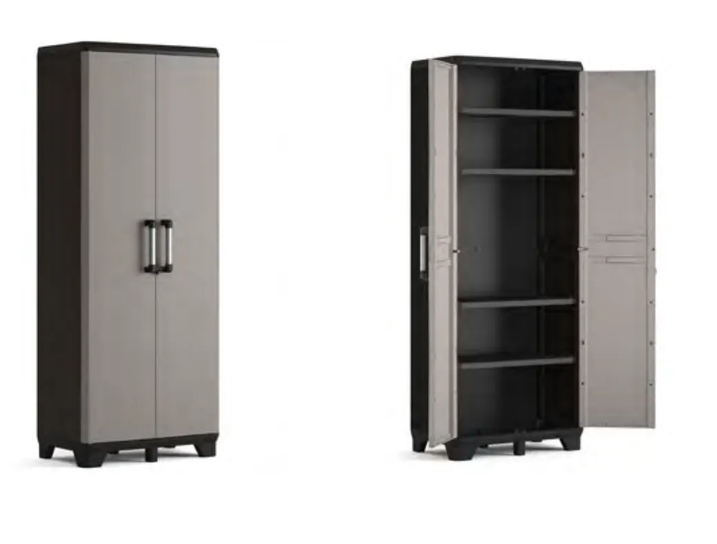 Zárható A Pro Tall Cabinet elegáns, modern minimalista megjelenésű, fekete és szürke szerkezettel, alumínium fogantyúkkal és 4 állítható, fém-erősítésű polccal, amelyek mindegyike 20 kg-ot bír el. Ez a szekrény könnyen karbantartható és rendkívül biztonságos a zárható ajtóinak köszönhetően. A megnövelt stabilitást 2 további központi láb és 4 sarok a szekrény hátulján rögzíti.