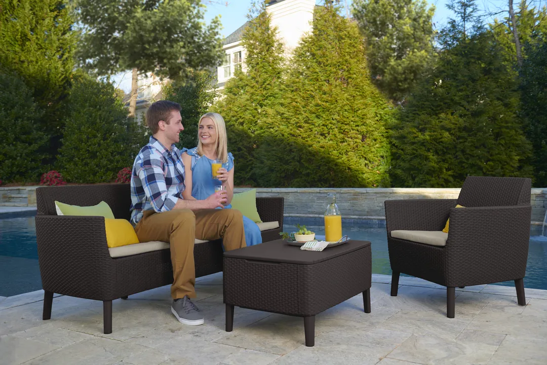 Modern dizájn, elegancia és a kényelmes használat az 5 személyes Salemo kerti bútor szett fő előnyei. A garnitúra egy széles, kényelmes háromszemélyes kanapét, 2 fotelt és egy tároló funkcióval rendelkező kis asztalt tartalmaz. A bútorokra jellemző az egyedi, természetes rattan fonás inspirálta felület, amely rendkívül esztétikus külsőt kölcsönöz nekik. A bútor szett tökéletesen beleillik a kertekbe, teraszokra, de akár a belterekbe is. A szett divatos színválasztékban kapható, nagyon egyszerű az összeszerelése és a karbantartása. Ellenáll a kedvezőtlen időjárási tényezők hatásának és az UV sugárzásnak is.