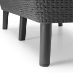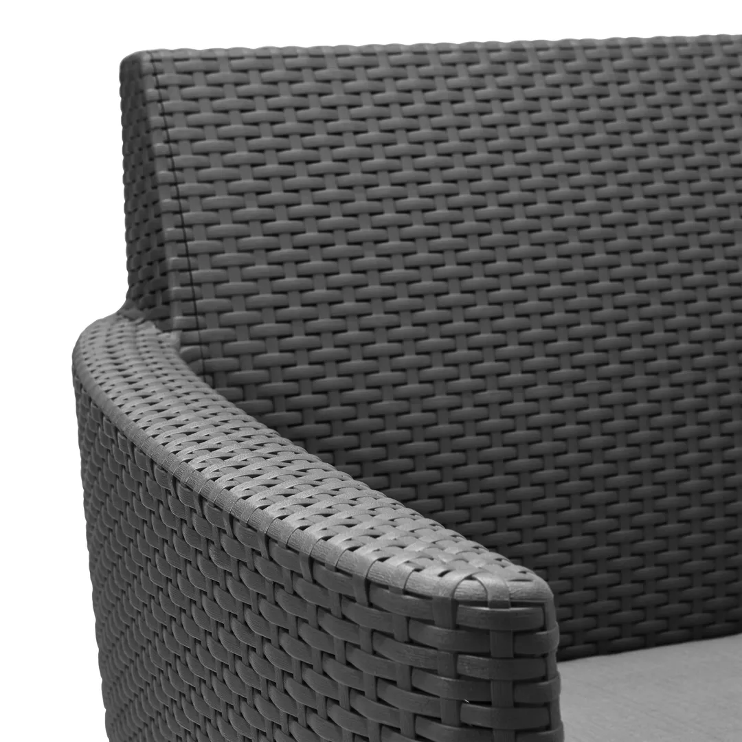 Modern dizájn, elegancia és a kényelmes használat az 5 személyes Salemo kerti bútor szett fő előnyei. A garnitúra egy széles, kényelmes háromszemélyes kanapét, 2 fotelt és egy tároló funkcióval rendelkező kis asztalt tartalmaz. A bútorokra jellemző az egyedi, természetes rattan fonás inspirálta felület, amely rendkívül esztétikus külsőt kölcsönöz nekik. A bútor szett tökéletesen beleillik a kertekbe, teraszokra, de akár a belterekbe is. A szett divatos színválasztékban kapható, nagyon egyszerű az összeszerelése és a karbantartása. Ellenáll a kedvezőtlen időjárási tényezők hatásának és az UV sugárzásnak is.