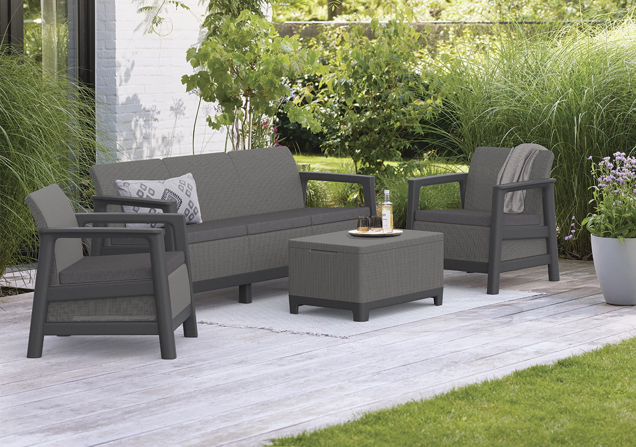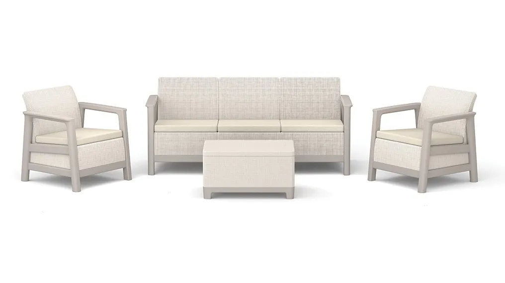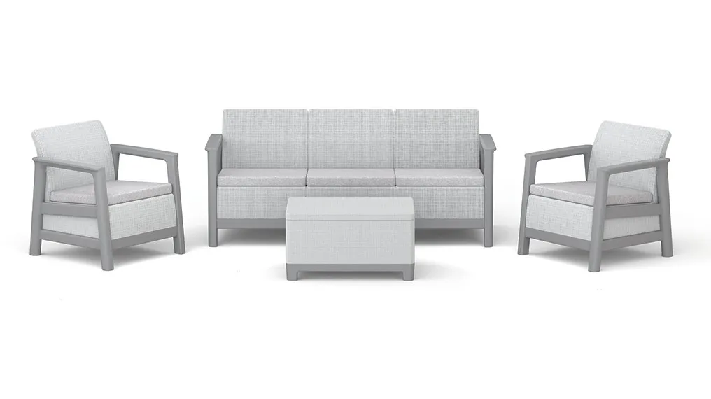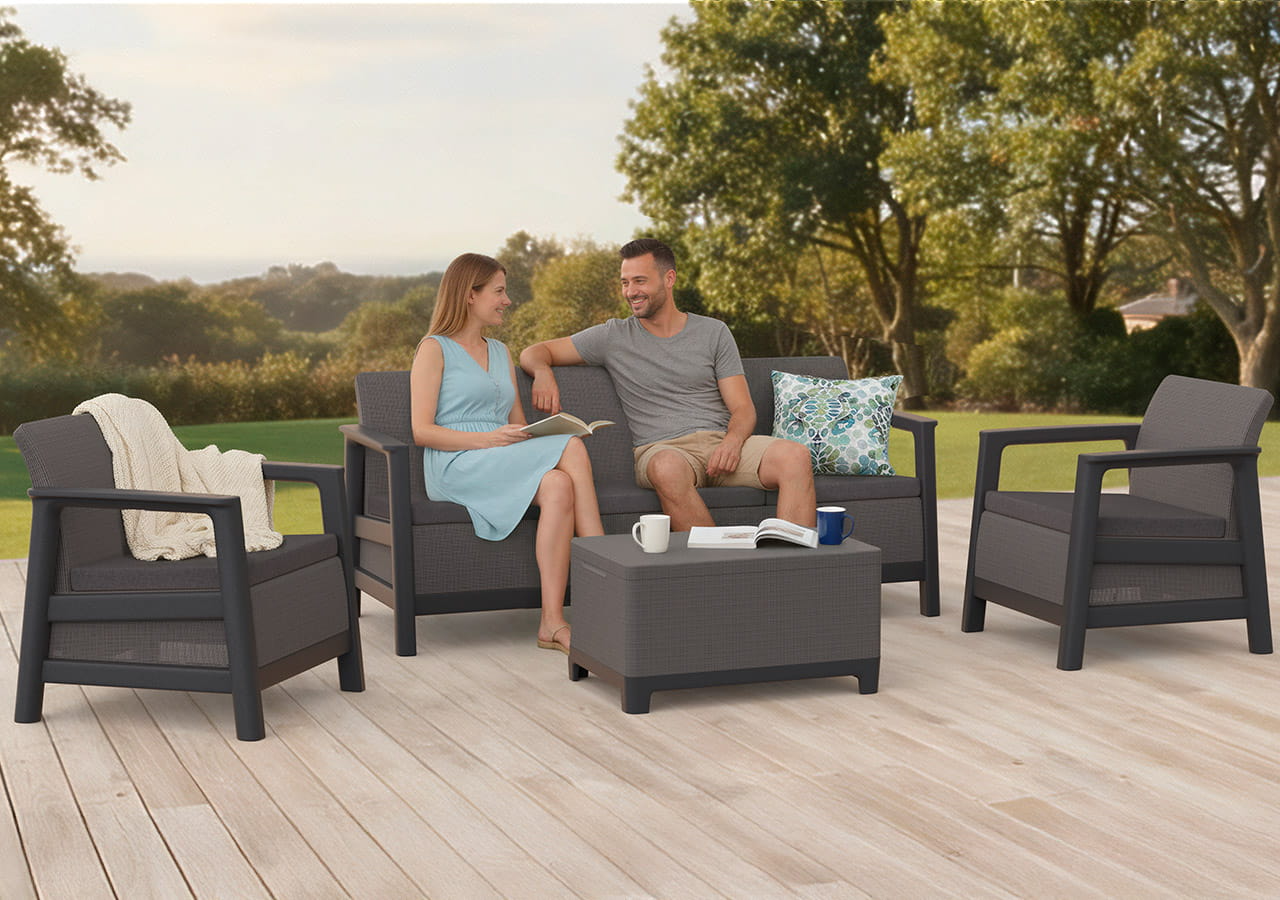 A szett két kényelmes fotelt, egy háromszemélyes kanapét és egy praktikus asztalt tartalmaz, további tárolóhellyel – tökéletes a dolgok rendszerezéséhez és a legfontosabb kiegészítők kéznél tartásához pihenés közben.