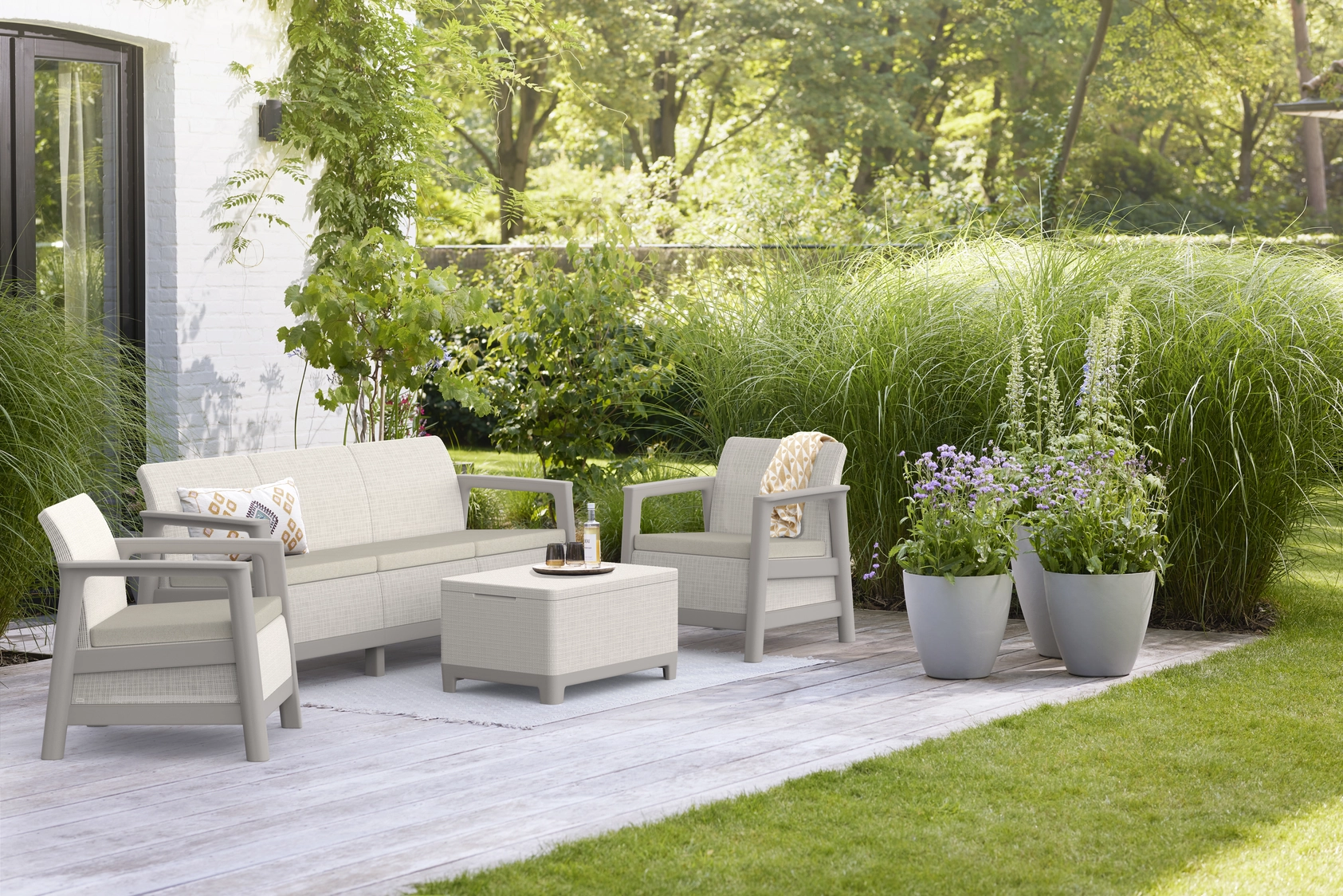 A garnitúra ellenáll a nedvességnek, az esőnek és az UV-sugárzásnak, így több évszakon át biztosítja esztétikus megjelenését.