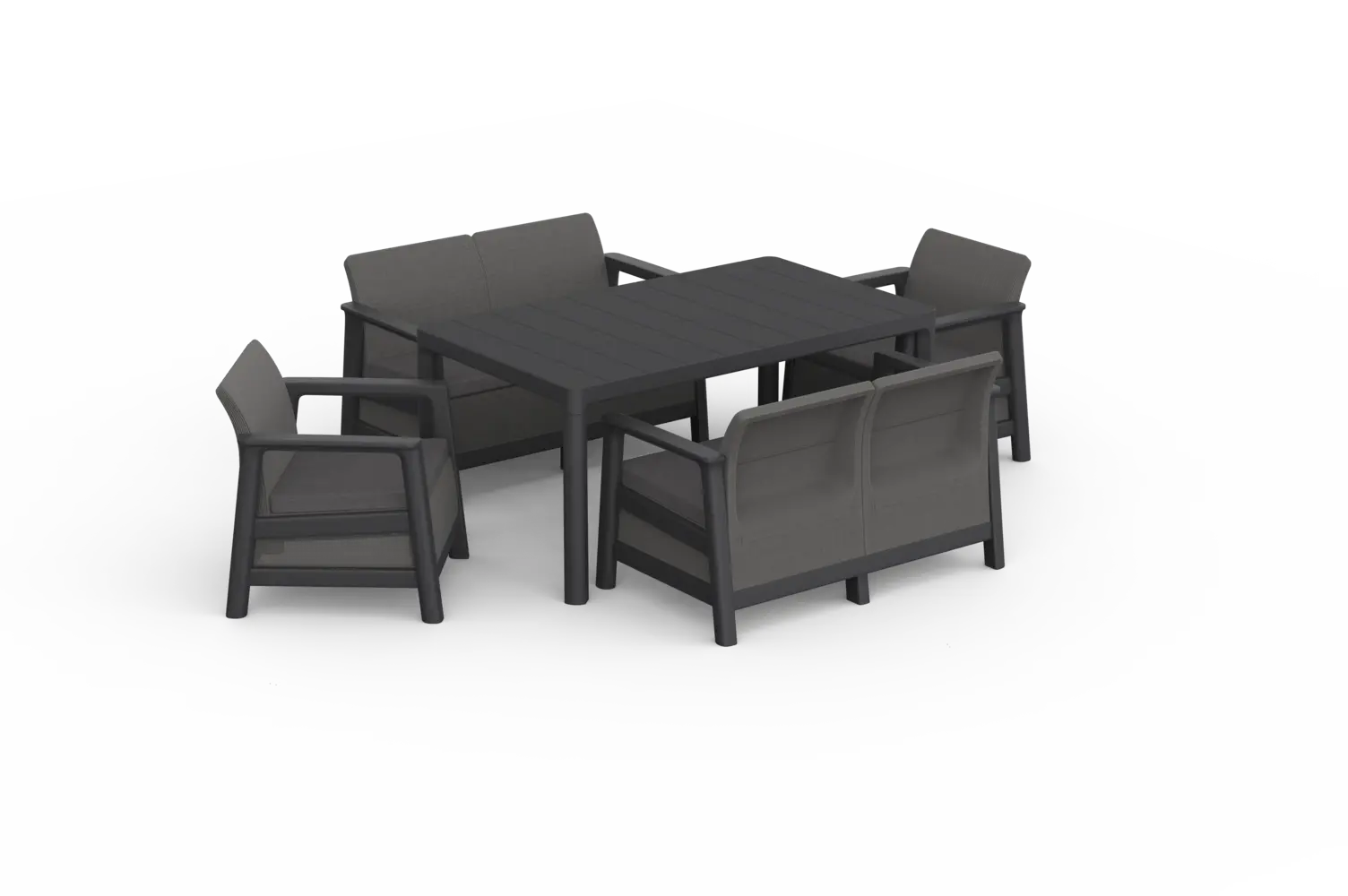 A szett két kétszemélyes kanapét, két kényelmes fotelt és egy tágas étkezőasztalt tartalmaz – egy olyan szett, amely ötvözi a nappali és az étkező funkciókat, így kényelmes, stílusos helyet teremtve a közös időtöltéshez a szabadban.