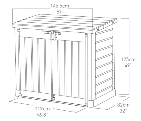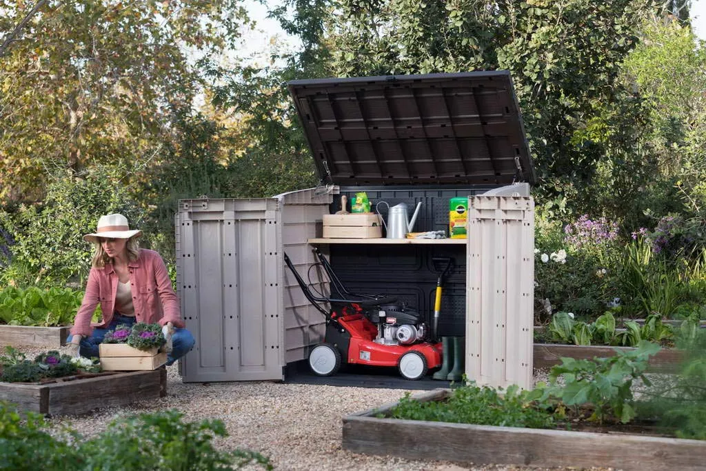 A Store It Out Max tároló egy jó megoldás, ha ötleteket keresünk a terasz, vagy a kert rendszerezésére. A tároló ideális a kerti tartozékok tárolására, legyen szó akár a grillsütőről, kerti szerszámokról, talicskákról, vagy kisebb kerti bútorokról. Magas minőségű anyagokból készült, hatékonyan megvédi a benne tárolt tárgyakat a nedvességtől és a szennyeződéstől. A nyitható fedél és a kétszárnyú ajtó megkönnyítik a használatát, erős szerkezete garantálja a termék tartósságát. A lekerekített küszöb lehetővé teszi a nagyobb tárgyak elhelyezését a tárolóban.