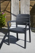 A Tisara egy stílusos és kényelmes szék, amely az egyszerű formájának köszönhetően ideálisan illik mind a belterekbe, mind a kertekbe. A kényelmes kartámaszok és háttámla tökéletes pihenést garantál. A szék tartós, ellenáll az időjárás viszontagságainak és UV sugárzásnak is. Tisztítása egyszerű, elég hozzá egy mosószeres vízbe áztatott puha törlőkendő.