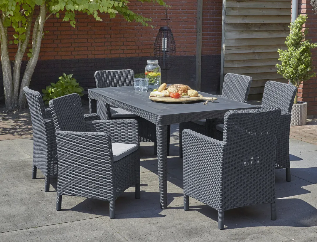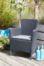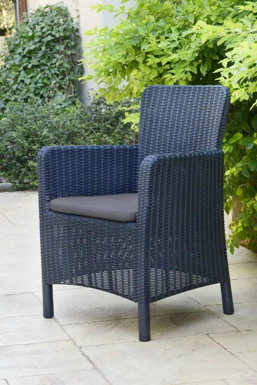 A modern Trenton fotel egyedi esztétikai megoldásokkal és funkcionális értékekkel rendelkezik: profilozott, lekerekített háttámlával és karfákkal, valamint kényelmes párnákkal kapható, amelyek komfortossá teszik a kerti, vagy a teraszon való pihenést. A termék még a legigényesebb vásárlókat is lenyűgözi a formatervezésével. A hagyományos fotel tökéletes alternatívája, stílusa a fonott rattanra emlékeztet. A gyártáshoz felhasznált magas minőségű műanyagnak köszönhetően ellenáll az időjárás viszontagságainak és az UV sugárzásnak is.